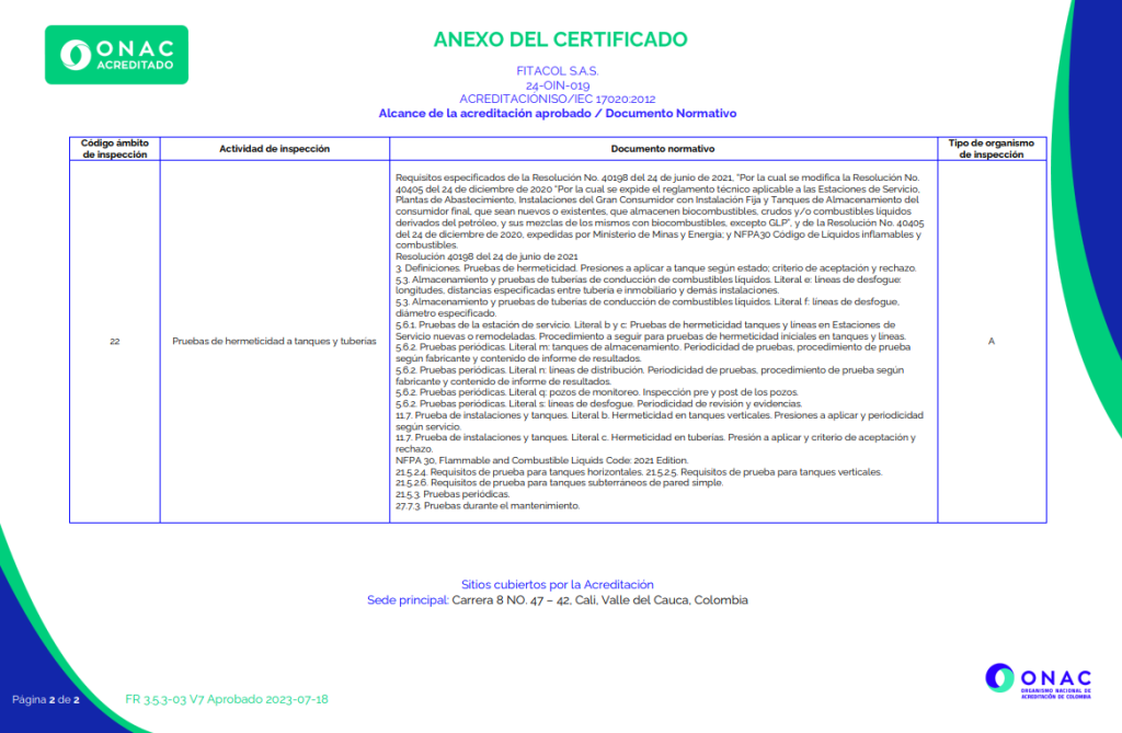 En Fitacol SAS contamos con acreditación ONAC, vigente a la fecha, con código de acreditación 24-OIN-019, bajo la norma ISO/IEC 17020:2012 para la realización de inspecciones de pruebas de hermeticidad a tanques y tuberías, según el alcance aprobado.