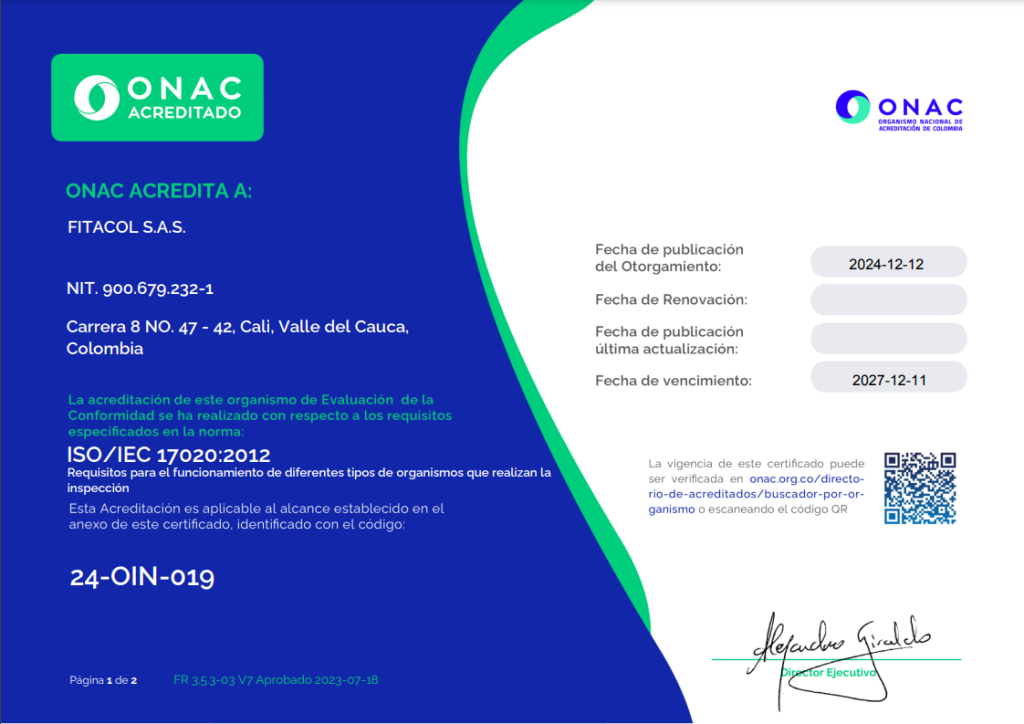 En Fitacol SAS contamos con acreditación ONAC, vigente a la fecha, con código de acreditación 24-OIN-019, bajo la norma ISO/IEC 17020:2012, garantizando procesos confiables y alineados con los estándares nacionales, brindando resultados verificados y respaldados por el ONAC